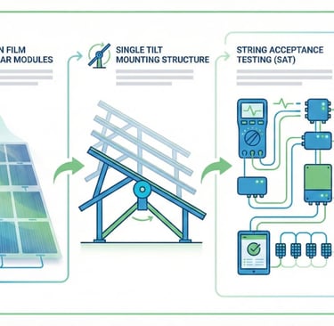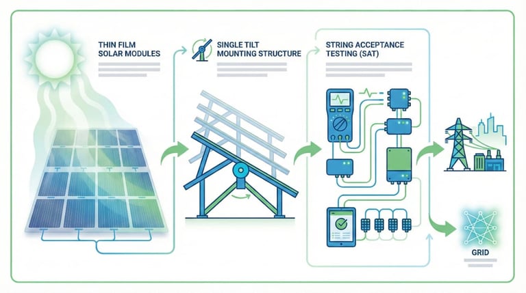 The Lothiyana Solar Power Project is designed with a performance-focused technology approach, incorporating Thin Film solar module technology to enhance energy generation under high-temperature and diffused light conditions. The plant follows a Single Tilt mounting configuration, optimized for site conditions to ensure stable generation, structural simplicity, and ease of long-term maintenance. To ensure quality and reliability from commissioning, String Acceptance Testing (SAT) was conducted to verify string-level electrical integrity and compliance with design parameters, establishing a strong foundation for consistent performance and long-term operational reliability.