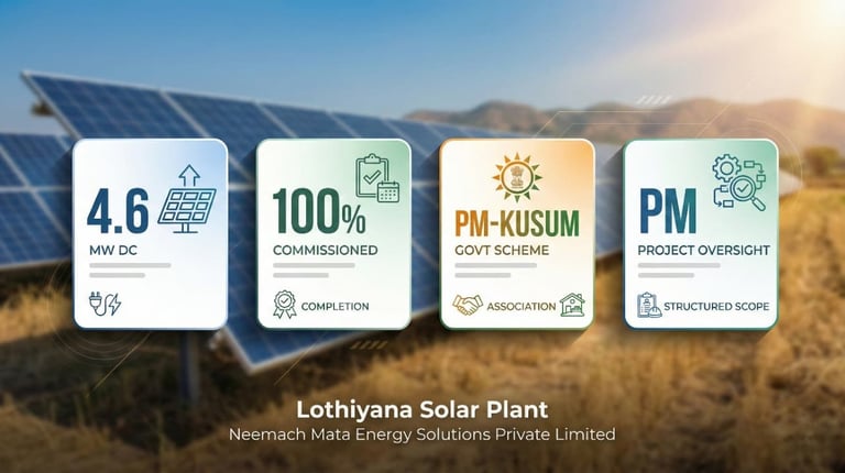 The Lothiyana Solar Power Project is a 4.6 MW DC commissioned solar power plant developed under the PM-KUSUM Yojana for Neemach Mata Energy Solutions Private Limited, contributing to India’s decentralized renewable energy infrastructure.